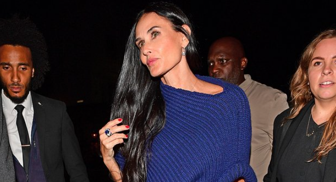 61-летнюю звезду запечатлели на предпоказе фильма The Substance в Лондоне. Она появилась на мероприятии в синих кожаных брюках-клеш и асимметричном вязаном свитере. Также на Мур были черные босоножки на платформе и высоком каблуке.