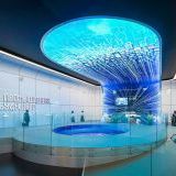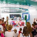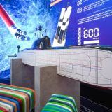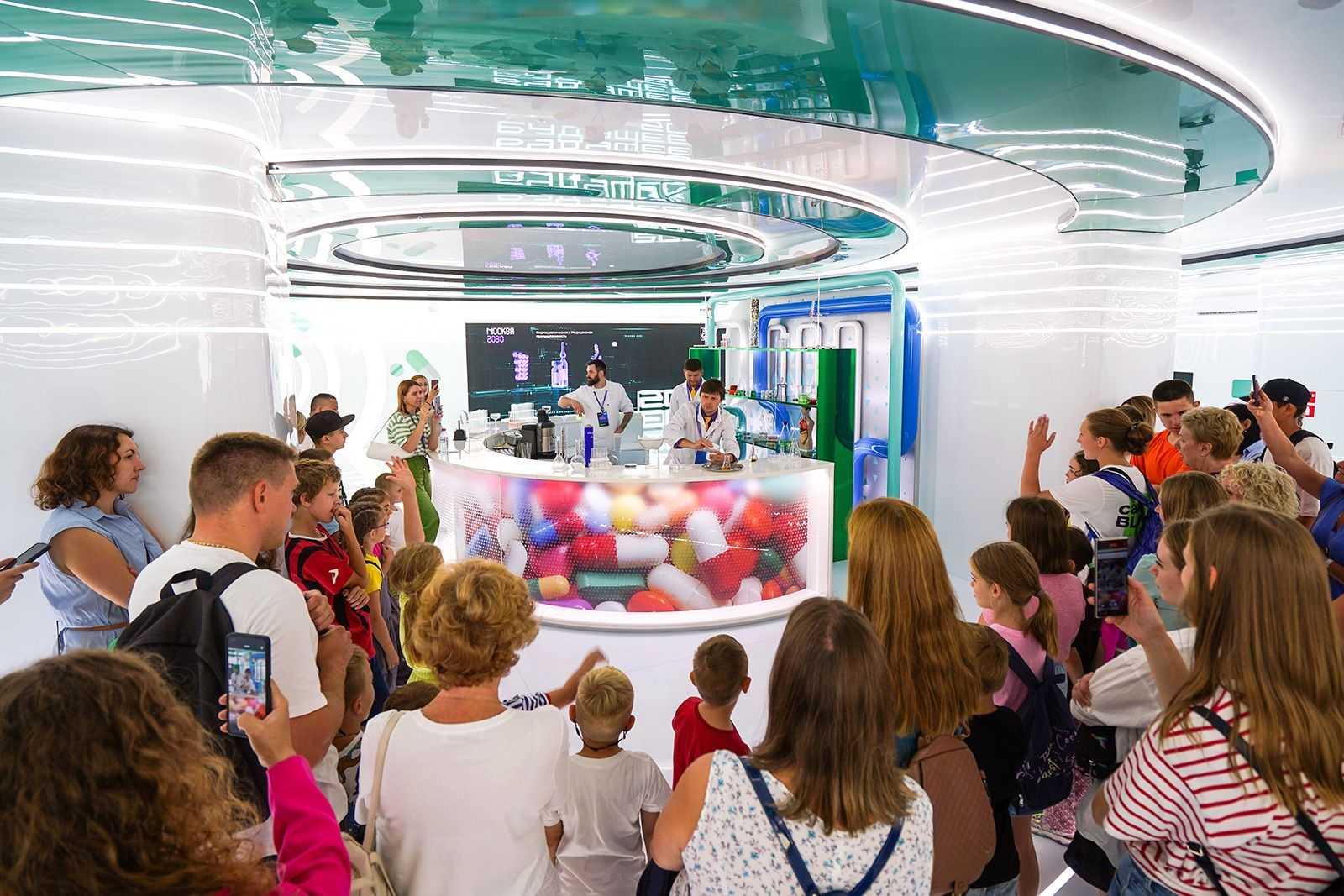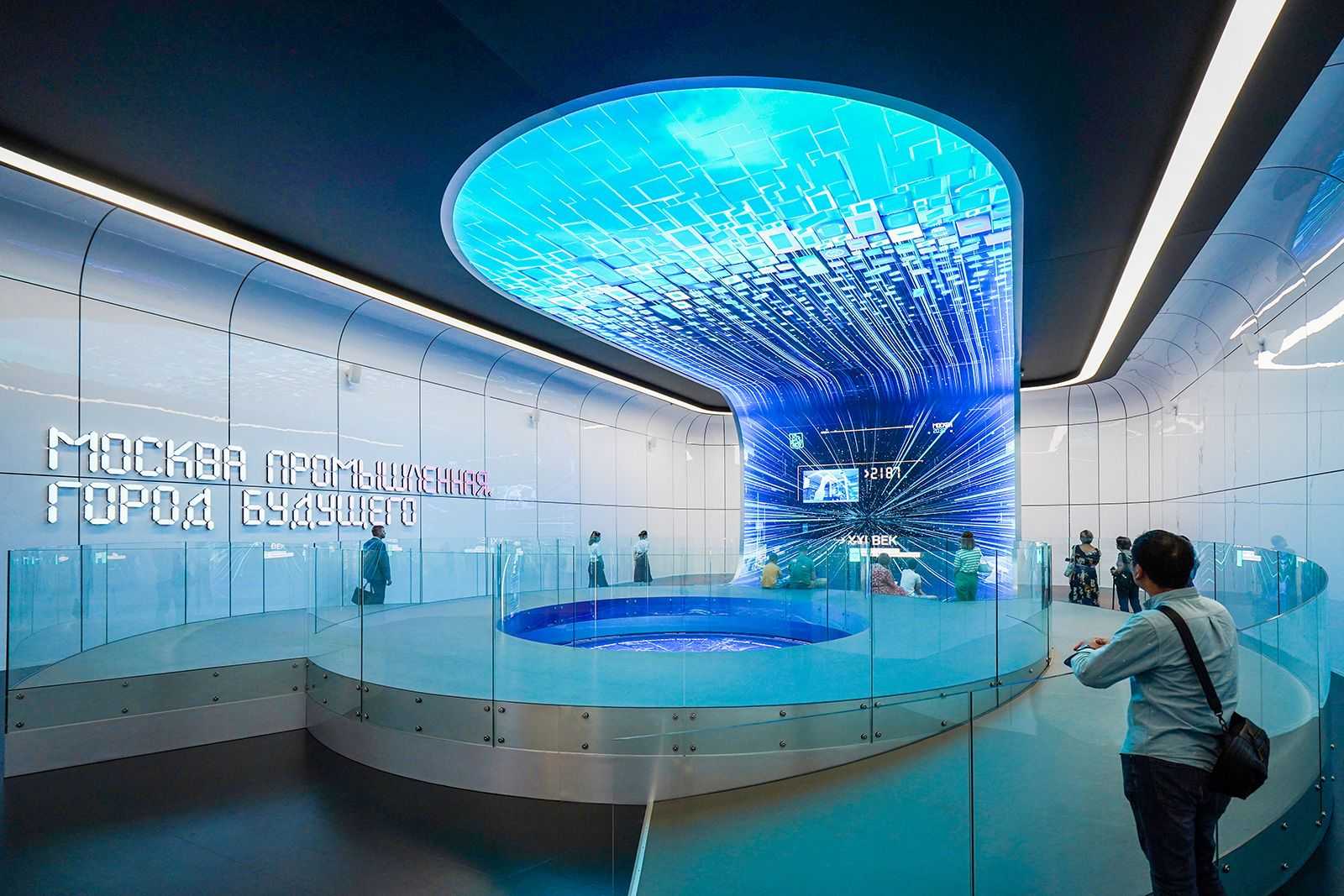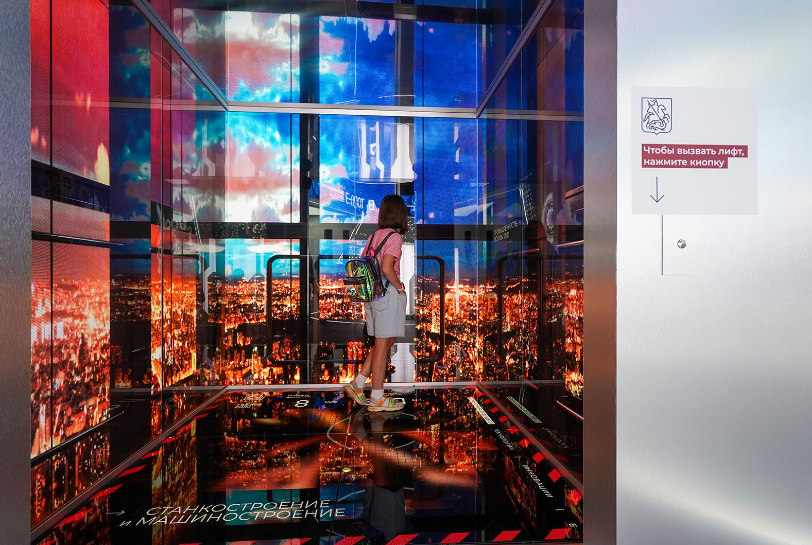 Взрослые изучают манипуляторы, лазеры и станки, а дети толпятся у лифтовых кабин, весело нажимая на кнопки. Один из лифтов имитирует подъем на высоту небоскреба — вокруг платформы установлены экраны «панорамные окна», и пассажиры наблюдают ночную Москву, поднимаясь вверх. Устройство полностью воссоздает ощущение скорости, знакомое нам по быстрым пассажирским лифтам.