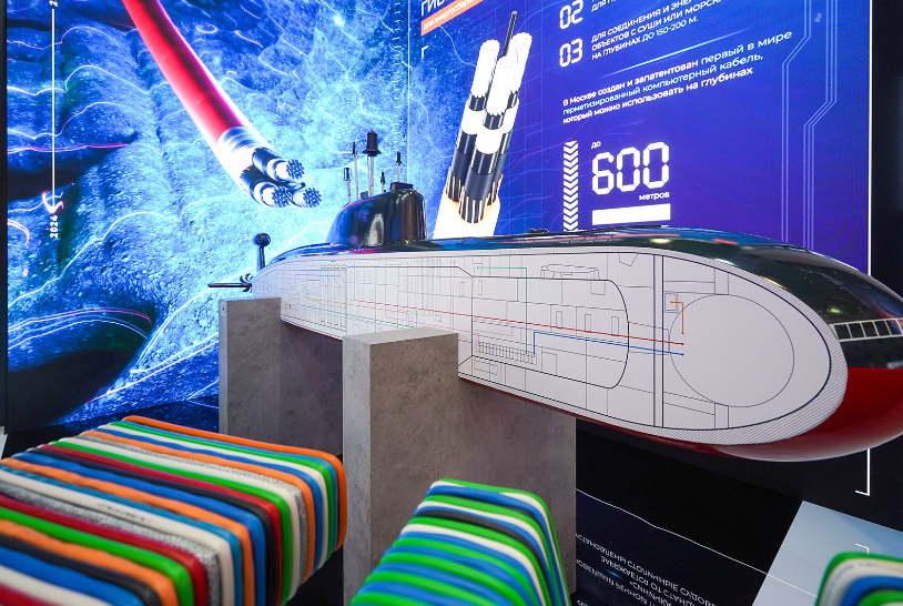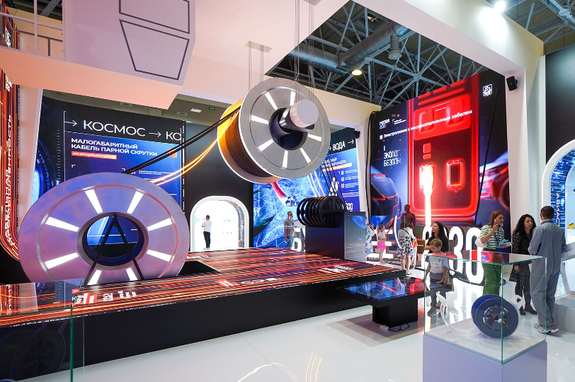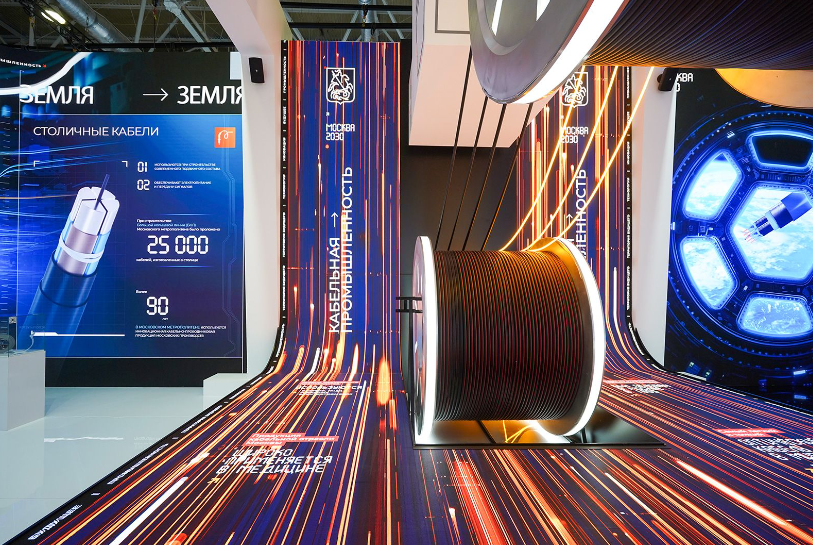 В следующем зале посетителей встречает скульптура мужчины, собранного из различных кабелей. Под потолком висят массивные катушки для намотки. Здесь экспонируются линии передачи для метро, нефтеперерабатывающих предприятий и атомных электростанций. Космический кабель от «Спецкабель» выглядит скромнее — он тоньше и легче, что не перегружает космический корабль: километр кабеля весит меньше полкило.