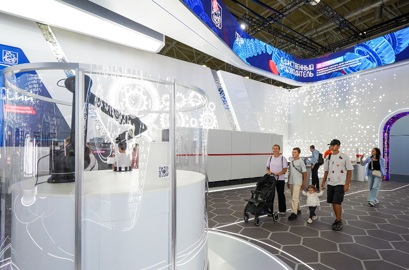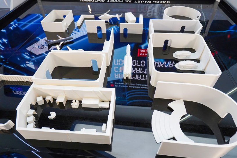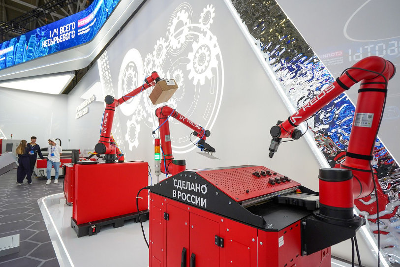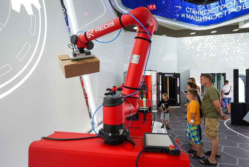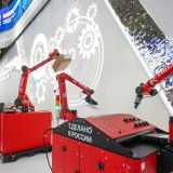 Первый сектор посвящен станко- и машиностроению. Здесь роботизированная рука мастерски обрабатывает детали, в то время как её «коллеги» беспрестанно перемещают коробки — на заводах такие роботы переносят тяжёлые предметы с линии на линию. Недалеко работает промышленный 3D-принтер, послойно создающий макет самой выставки — копии стен залов и ключевых экспонатов уже готовы, но работа продолжается.