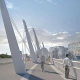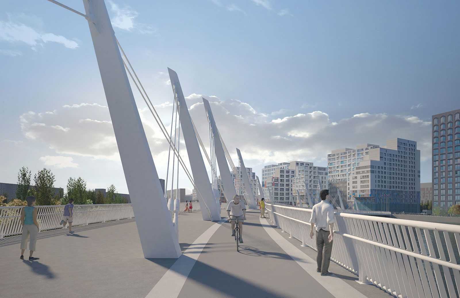 По словам мэра Москвы Сергея Собянина, строительство моста уже завершено на две трети. В настоящий момент специалисты занимаются опусканием пролетного строения на опорные части, возводят подпорную стену и организуют инженерные коммуникации. Важной особенностью нового моста будет его форма полумесяца, что придаст ему выразительность. Для подчеркивания архитектурных особенностей моста разработана особая концепция деликатного освещения основных конструктивных элементов.