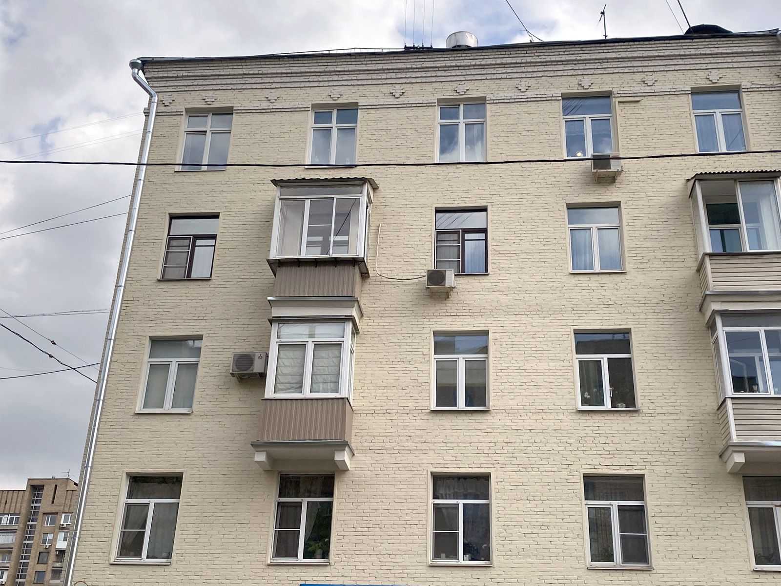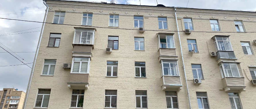 Ремонт пятиэтажного дома 43–47 на улице Плющихе завершился. Здание, построенное в 1958 году по типовому проекту, имеет г-образную форму и украшено декоративными элементами, такими как пояс, орнамент и многопрофильный карниз, выполненными из кирпичной кладки.